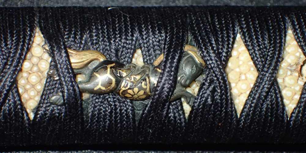 Nakago: ō-suriage, kirijiri, katte-sagari yasurime, two mekugi-ana (of which one is plugged), mumei