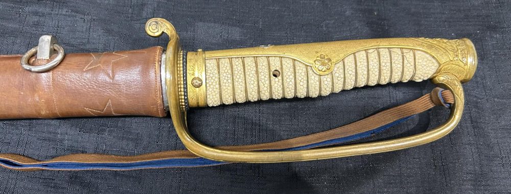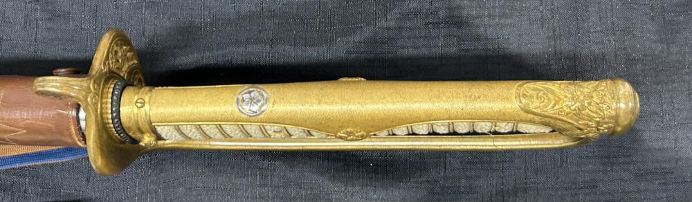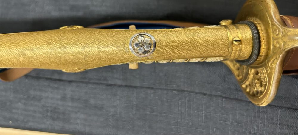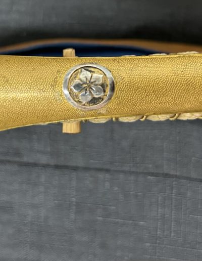 Saneyuki Katana mounted in original Kyu Gunto Koshirae with Silver family Mon and High Quality 2 Piece Habaki. Excellent very well forged Blade with active Hamon packed with Hataraki.