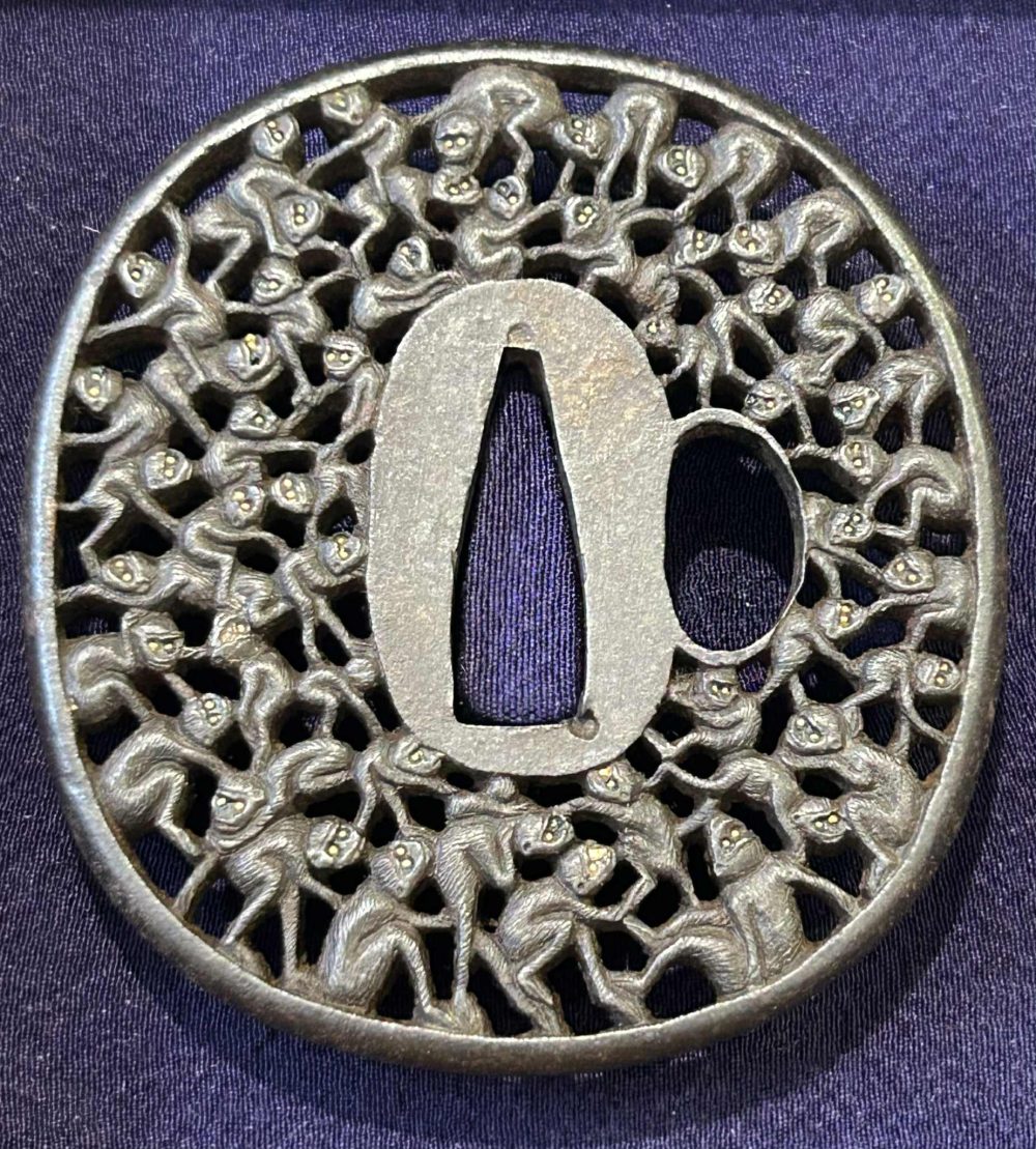 The Thousand Monkey Tsuba (Senbiki-zaru) is a renowned type of Japanese sword guard featuring a motif of a great number of densely carved monkeys in openwork. This design is a hallmark of the Yagami School based in the Hizen province (present-day Nagasaki Prefecture).