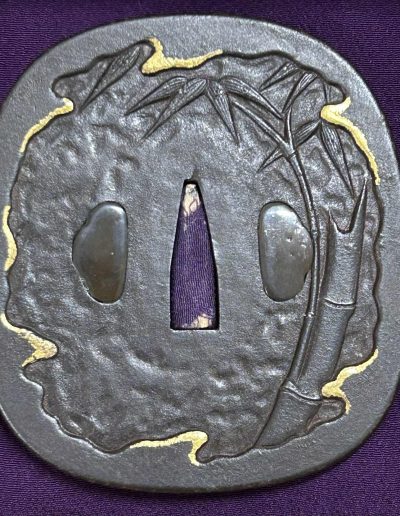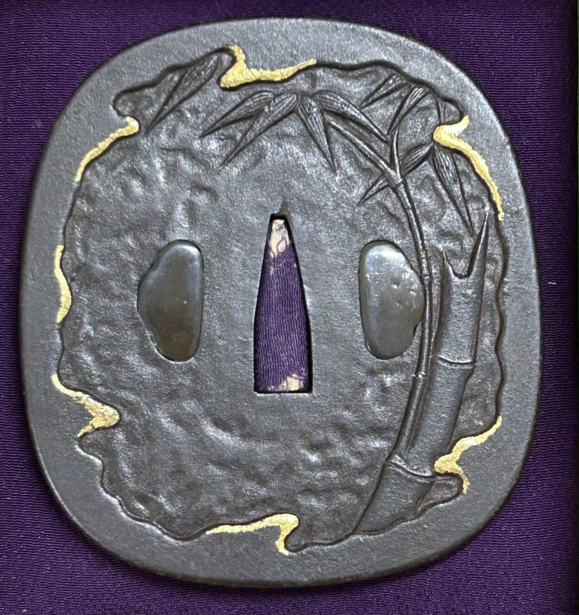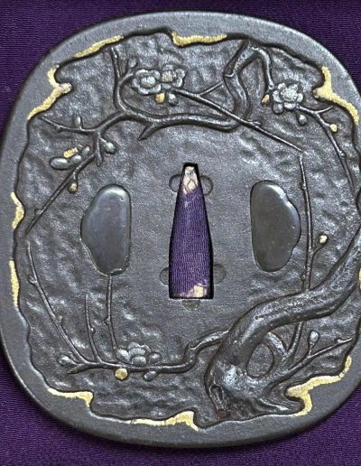 Large Iron Toryusai Tsuba with Motif of Bamboo and Plum tree and Blossoms . Late Edo Period with NBTHK Tokubetsu Kicho Certificate