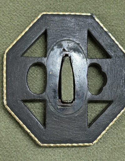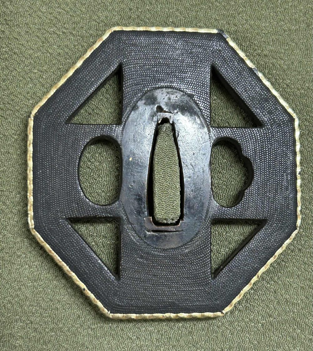 Shakudo Cross Tsuba with fine Nanako, Gold Fukurin with detailed nicely detailed pattern